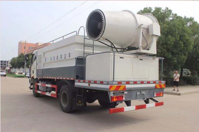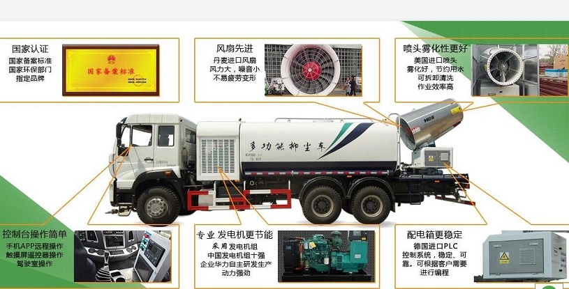 噴霧抑塵車隨車裝配大功率柴油機、三相交流同步發電機、三相異步電動機、三缸活塞泵,并安裝風機風炮,為農藥噴灑提供專一動力來源和專用設備。灑水泵可抽水排水,安裝濾網,帶消防接口,可通過消防栓進水,帶自流閥,隨車選裝20米噴藥綠化卷盤